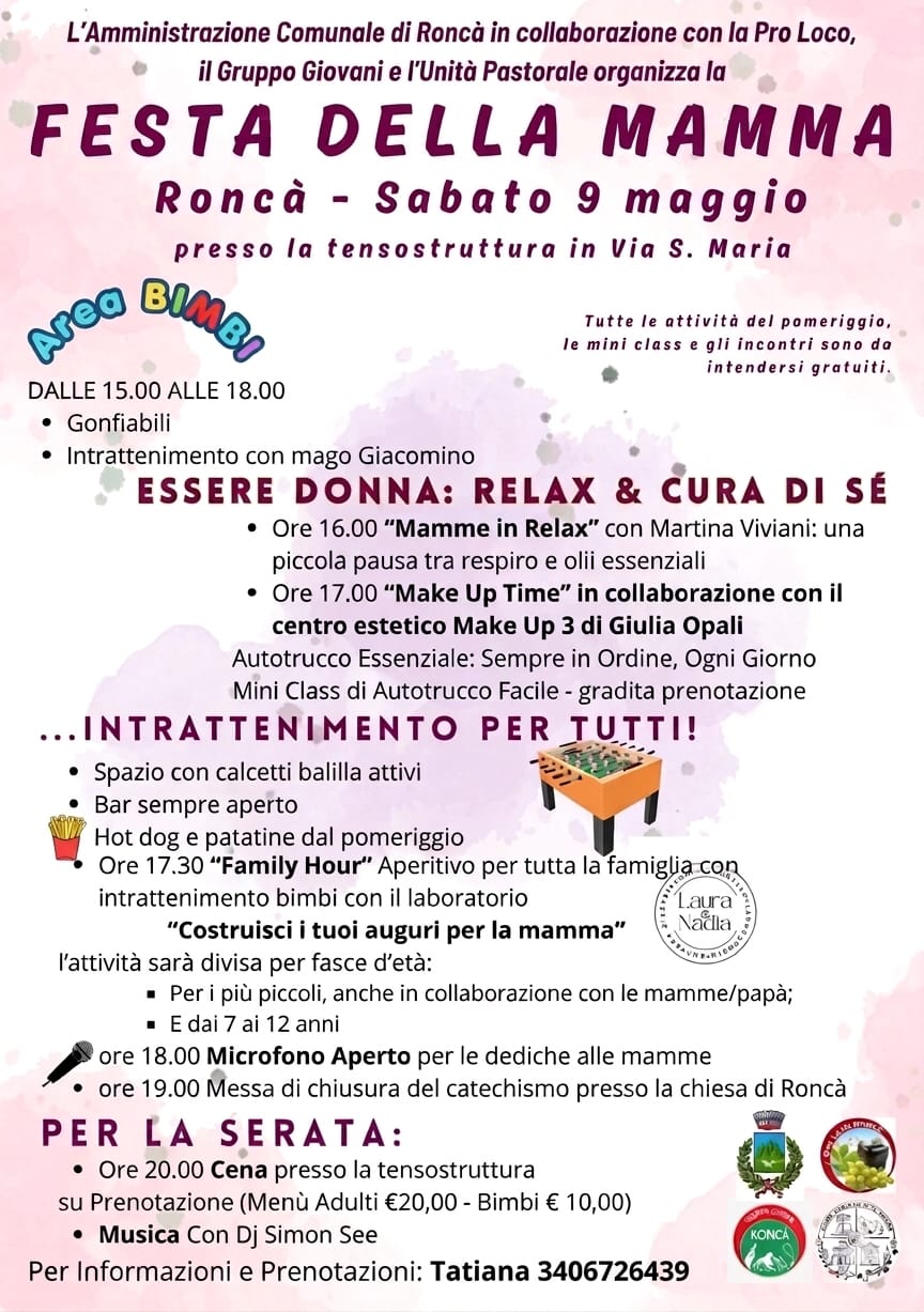 In occasione della festa della mamma, l'Amministrazione Comunale di Roncà in collaborazione con la Pro Loco, il Gruppo Giovani e l'Unità Pastorale organizza la Festa della mamma.